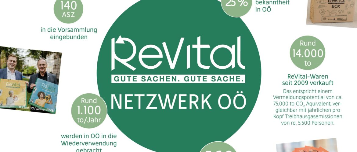 • Seit dem Jahr 2009 konnten rd. 14.000 Tonnen qualitätsgeprüfte ReVital Waren verkauft werden, dies entspricht einem Vermeidungspotential von etwa 75.000 Tonnen CO2-Äquivalente, vergleichbar mit jährliche pro Kopf Treibhausgasemissionen von rd. 5.500 Personen